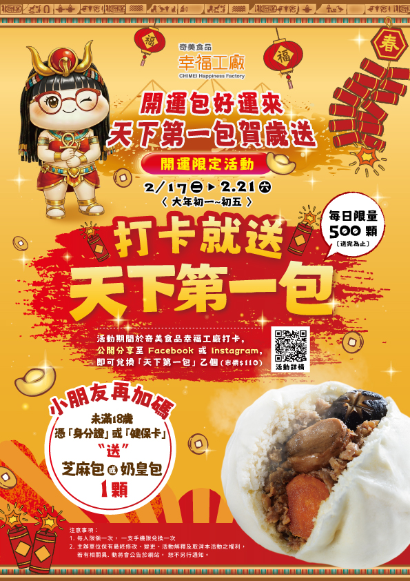 「奇美食品幸福工廠」於大年初一至初五(2 月 17 日至 2 月 21 日)推出春節限定活動【開運包好運來|天下第一包賀歲送】,邀請民眾過年來走春、拍照打卡,把新年好運通通「包」回家。